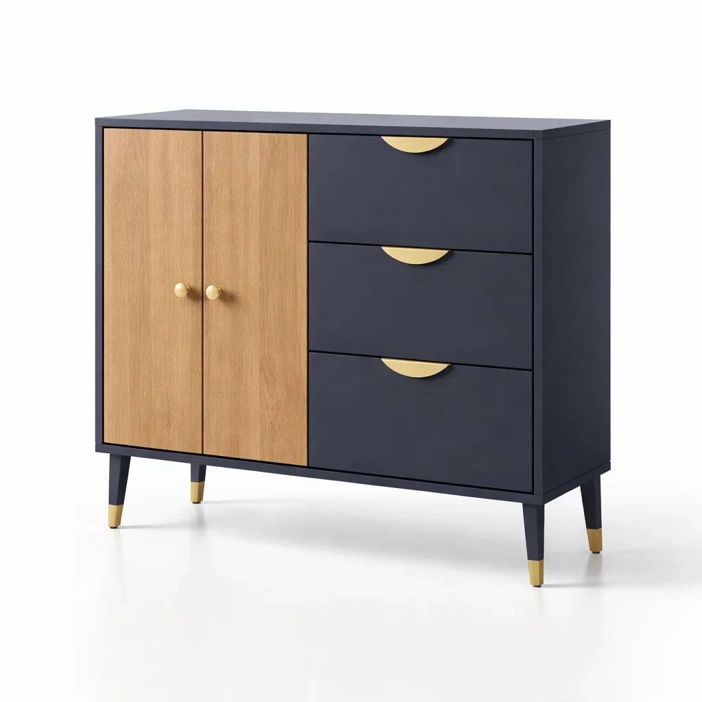 Ce buffet est fabriqué en bois d'ingénierie avec une finition laquée et un placage de chêne. Il comprend trois tiroirs et deux portes, offrant un espace de rangement pratique. Les poignées sont en métal doré.